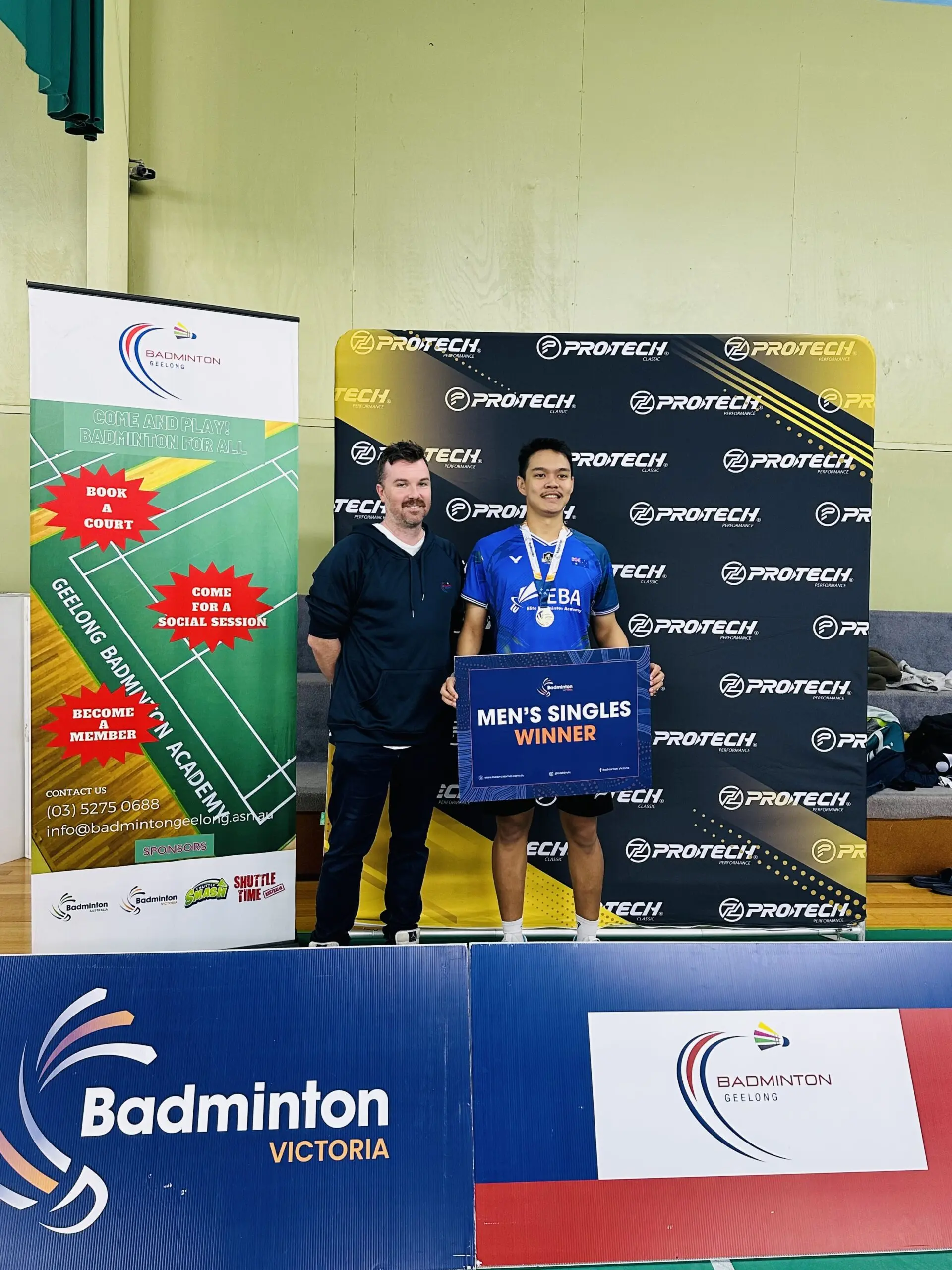 CEO of Elite Badminton Academy presenting at the podium to Indonesian Legendary Duo Mohammad Ahsan and Hendra Setiawan, as well as the Chinese winners at the 2024 Badminton World Federation Super 500 Australian Badminton Open, alongside BWF Vice President and Badminton Australia President.